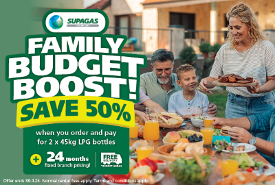 Order and pay for 2 x 45kg LPG bottles of gas and get 30% Off your gas price for your first order! Plus 24 months fixed branch pricing! Standard rental charges apply. Offer available from Supagas Branches that...