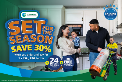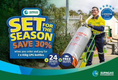 Order and pay for 2 x 45kg LPG bottles of gas and get 30% Off your gas price for your first order! Plus 24 months fixed branch pricing! Standard rental charges apply. Offer available from Supagas Branches that service Geraldton, Esperance, Broome, Port Hedland and Karratha areas. Terms and conditions apply